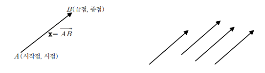 - 2차원 및 3차원 공간에서 vector는 화살표(시작점 -> 끝점)로 표현 가능 (화살표의 길이는 벡터의 크기, 화살표의 방향은 벡터의 방향)