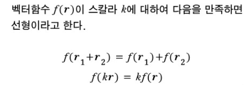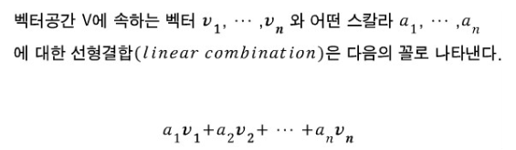 벡터 공간에서 가능한 연산인 덧셈과 스칼라배로 구성된 벡터들의 결합을 선형결합(linear combination)이라 한다.