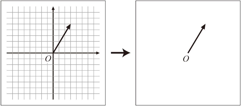그렇다면, 그림 3-1과 같이 원점만 표시되어 있는 (방향성이 없는) 깨끗한 하얀 도화지에서 끝점의 위치는 어떻게 지정할 수 있을까? 단순히 여기, 저기, 거기라고 할 수는 없으니 이때, 기저(basis, base) 개념을 도입한 것이다.