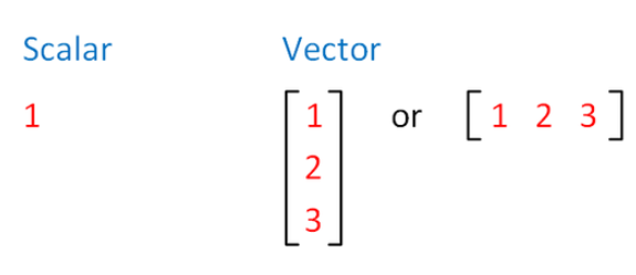 위의 기하학적 의미가 사실 쉽게 와닿지 않는데, scalar는 수, vector는 수의 나열(수를 일렬로 늘어놓은 1차원 배열;array)이라고 일단 간단히 생각하면 된다. (기하학적 의미는 형식상 적은 것이다.)