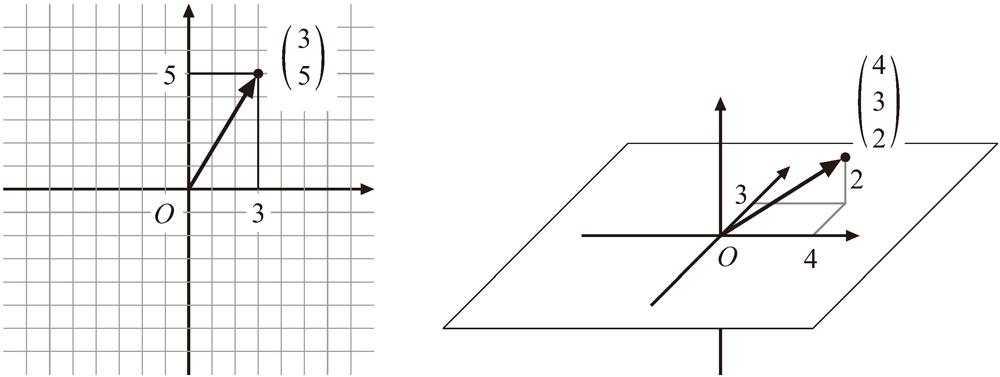 위의 그림과 같이, 2차원 및 3차원 벡터를 공간 안에 점으로 표시할 수 있다. 이때, 영벡터는 모든 성분(component)가 0인 벡터로 원점(O)이라고 불리기도 한다.