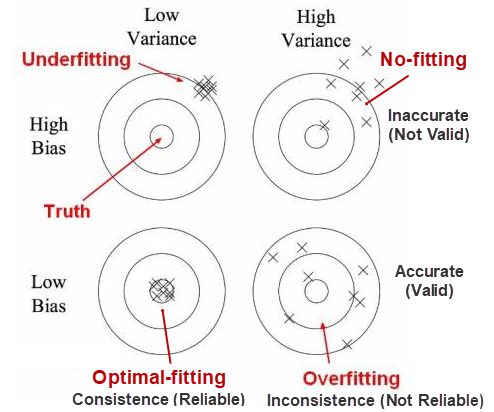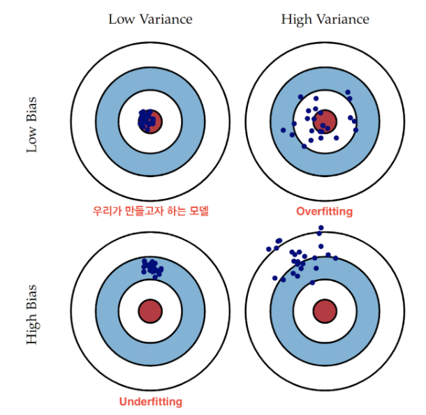 Overfitting은 High Variance Low Bias (높은 분산 낮은 편향), Underfitting은 Low Variance High Bias (낮은 분산 높은 편향)라고 볼 수 있다. 최적의 fitting은 Low Variance Low Bias (낮은 분산 낮은 편향)이다. +) Bias - Variance Tradeoff