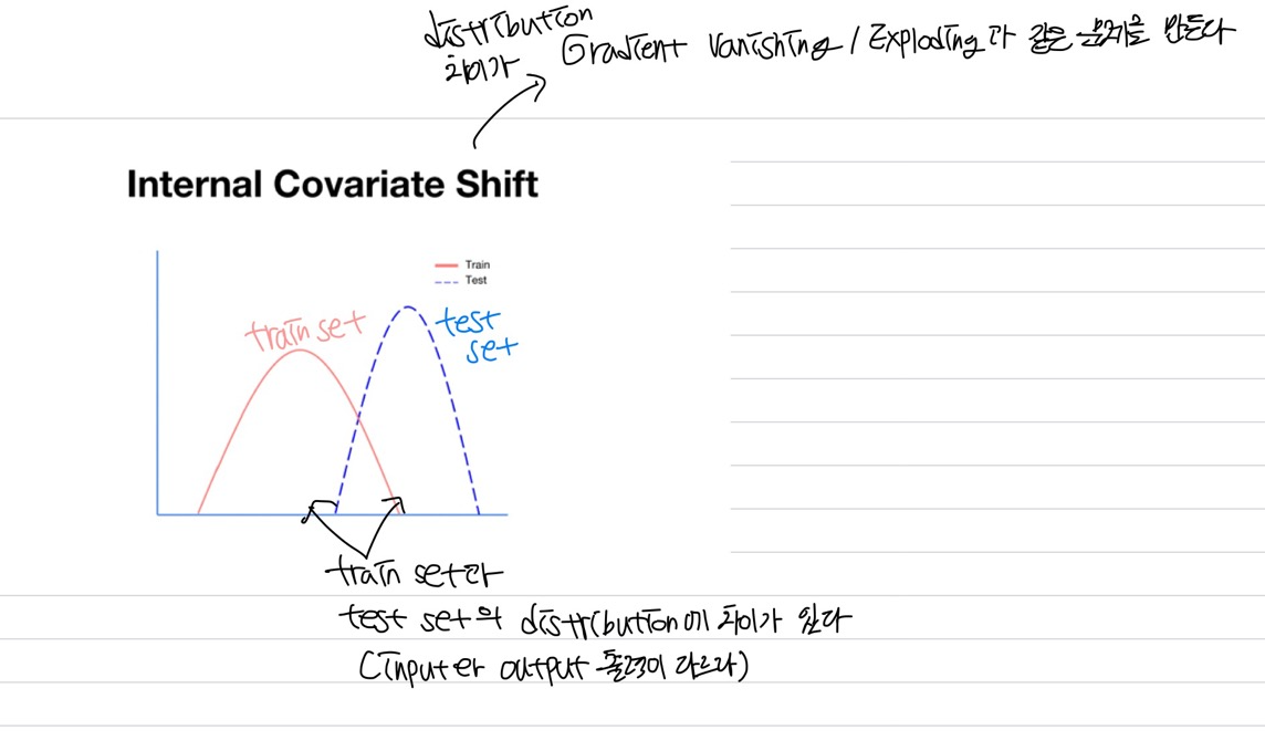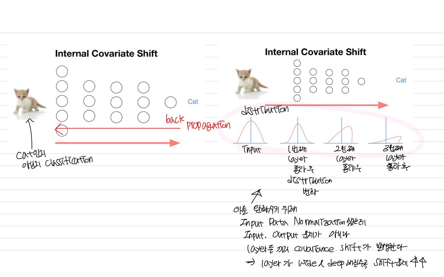 Internal Covariance Shift : 각 Layer마다 Input 분포가 달라짐에 따라 학습 속도가 느려지는 현상