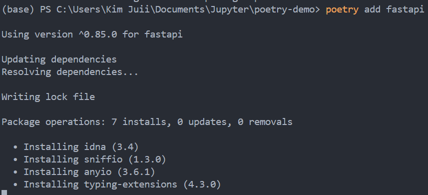 poetry add fastapi 한 후에 poetry.lock 파일이 생성된 것을 확인할 수 있다. package 설치하면, 설치한 패키지와 버전을 poetry.lock에 기록한 후, 해당 프로젝트를 lock 한다. 모든 사용자들이 완전히 동일한 version of dependency로 lock 되어 있는 프로젝트를 사용할 수 있다. 협업할 때, 해당 프로젝트에서 모든 사용자가 동일한 dependency를 사용할 수 있기 때문에 충돌이 줄어들 것이다.