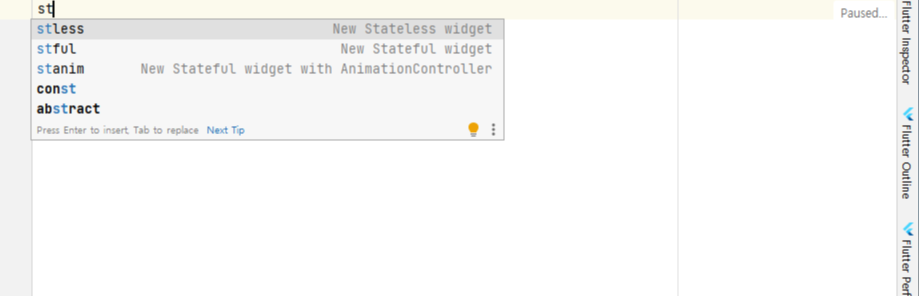 정말 정말 정말 자주 사용하는 단축키이다. st만 입력하면 기본 코드 완성으로 하단에 stful과 stless가 나온다. 그리고 나서 Tab을 누르면 자동으로 Stateless 위젯과 Stateful 위젯을 생성해준다.
